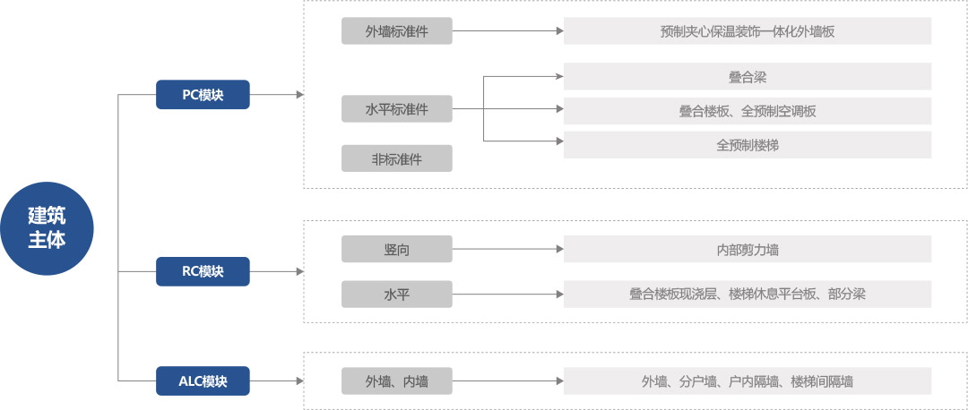 建筑主體可分為現(xiàn)澆模塊和預(yù)制模塊,預(yù)制模塊又可分為PC模塊和ALC模塊。
